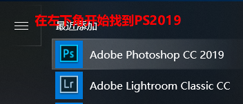 7、在左下角开始栏目中选择PS2019打开
