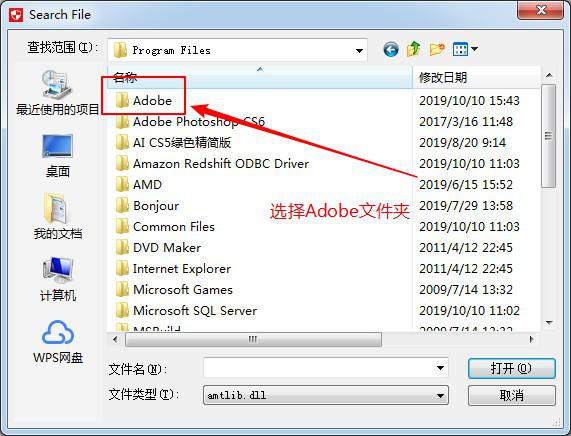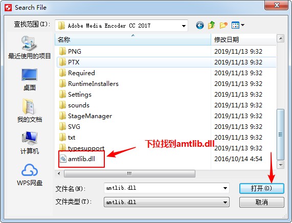 5. 选择我的电脑-C盘-Program Files-Adobe-Adobe Media Encoder CC 2017-Support Files-找到amtlib.dll并选择打开这个文件